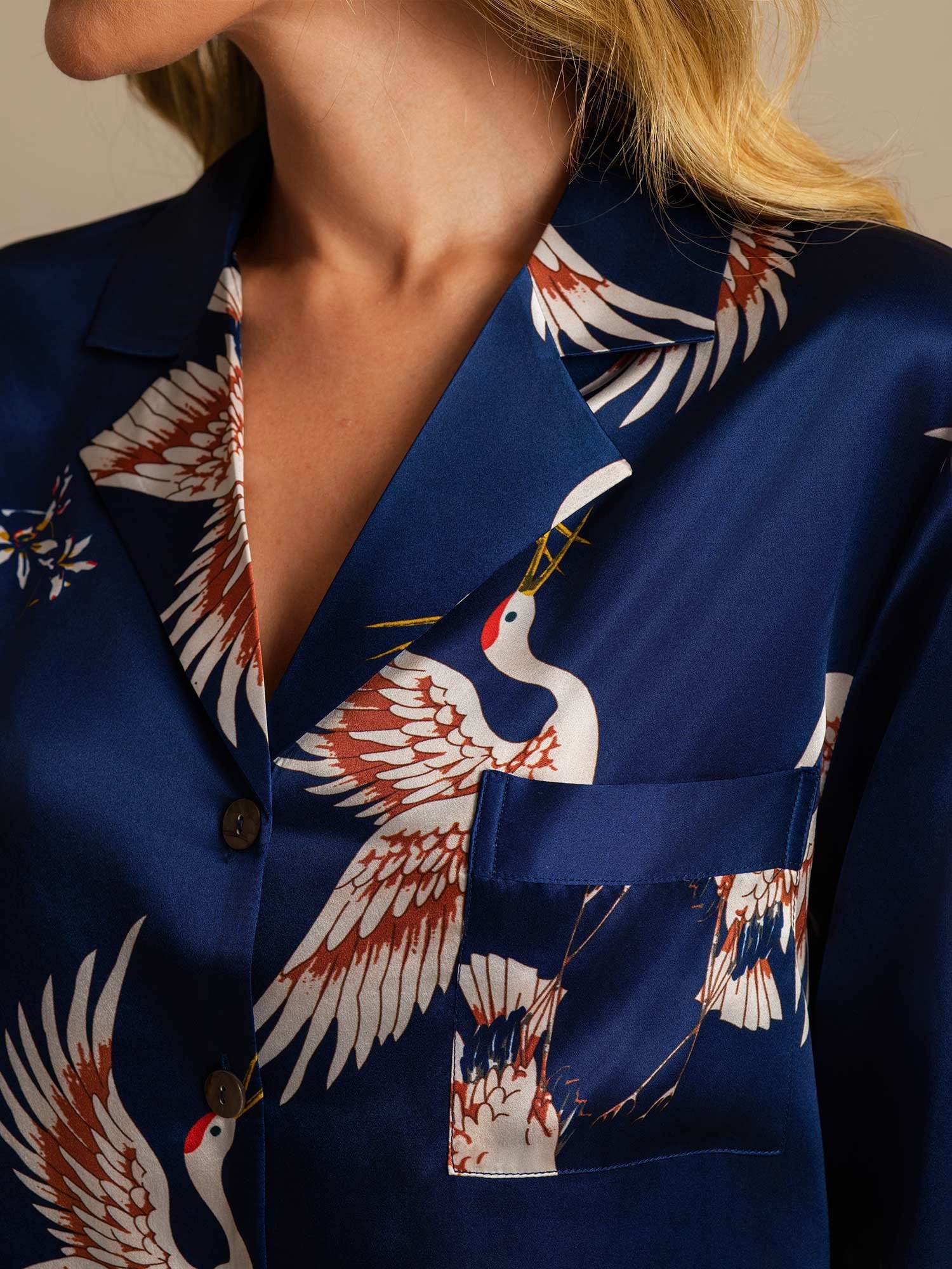 19Momme Pure Silk Crane Print Nightshirt with High-Low Hem