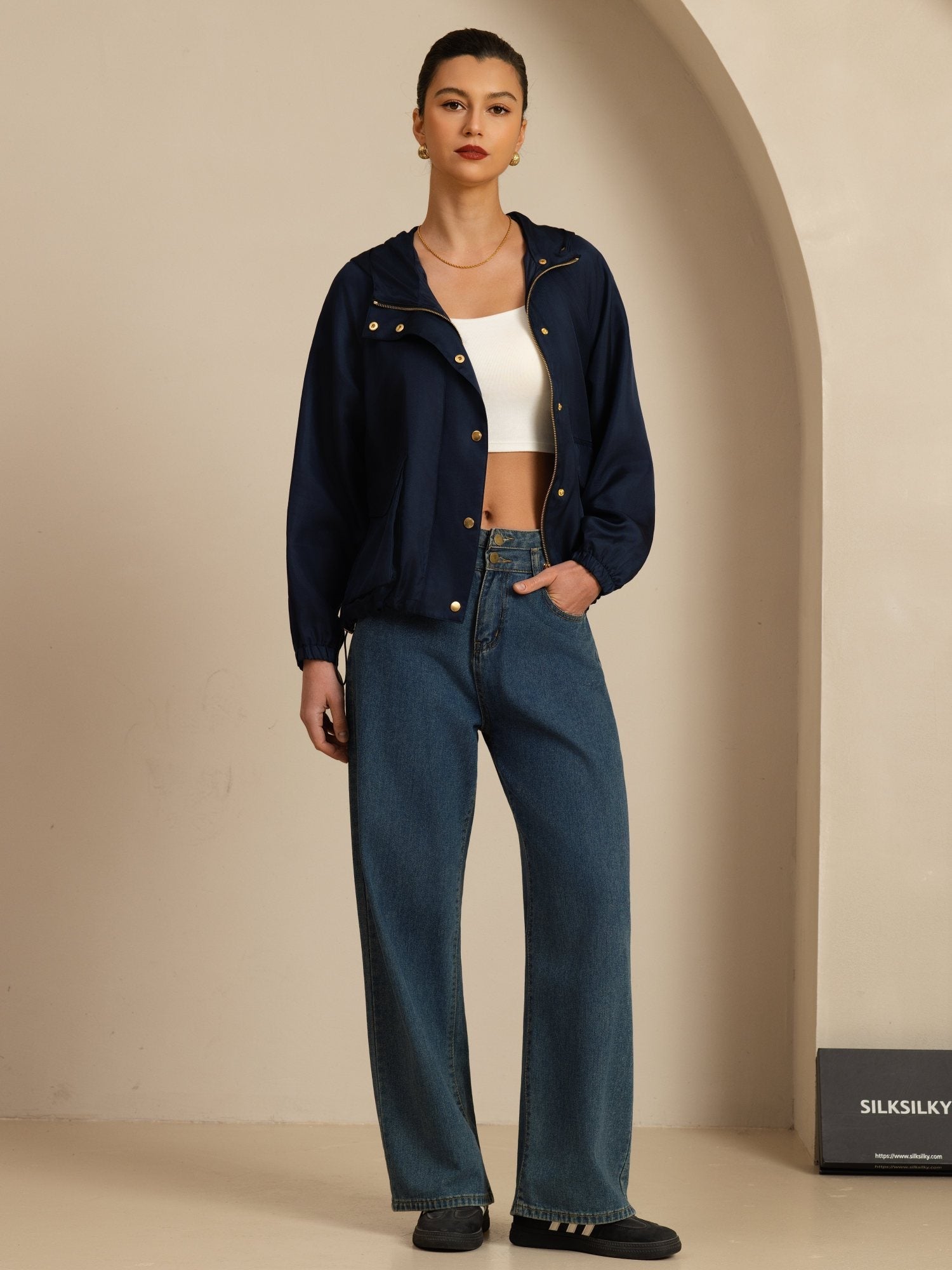 Made from 18Momme silk satin surah, this jacket offers a silky-smooth touch with a subtle luster, combining lightweight comfort and refined texture. The cropped design visually elongates the figure, while the elastic waist and drawstring allow easy adjustment for a secure, flattering fit. It's suitable for everyday wear in spring and autumn, and it's also easy to pair with shorts, jeans, or casual pants.