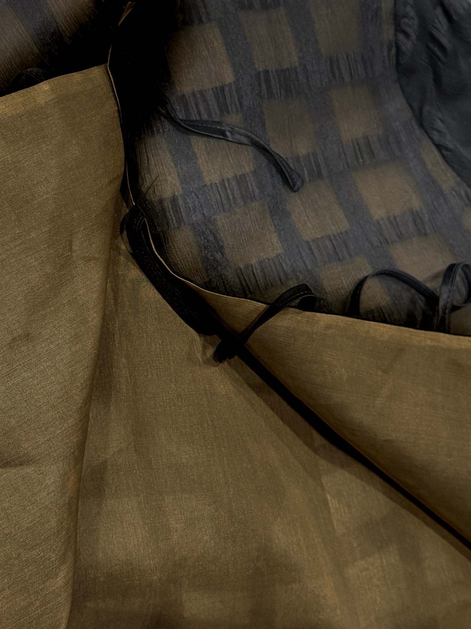 Made of silk organza overlay with pure silk lining, featuring a textured grid jacquard pattern. The round neckline creates a clean, classic frame, while the adjustable tie detail adds subtle femininity. Layered construction enhances dimension and movement, and the long sleeves balance the cropped length for a modern silhouette. Blending casual ease with timeless elegance, it elevates everyday styling effortlessly.