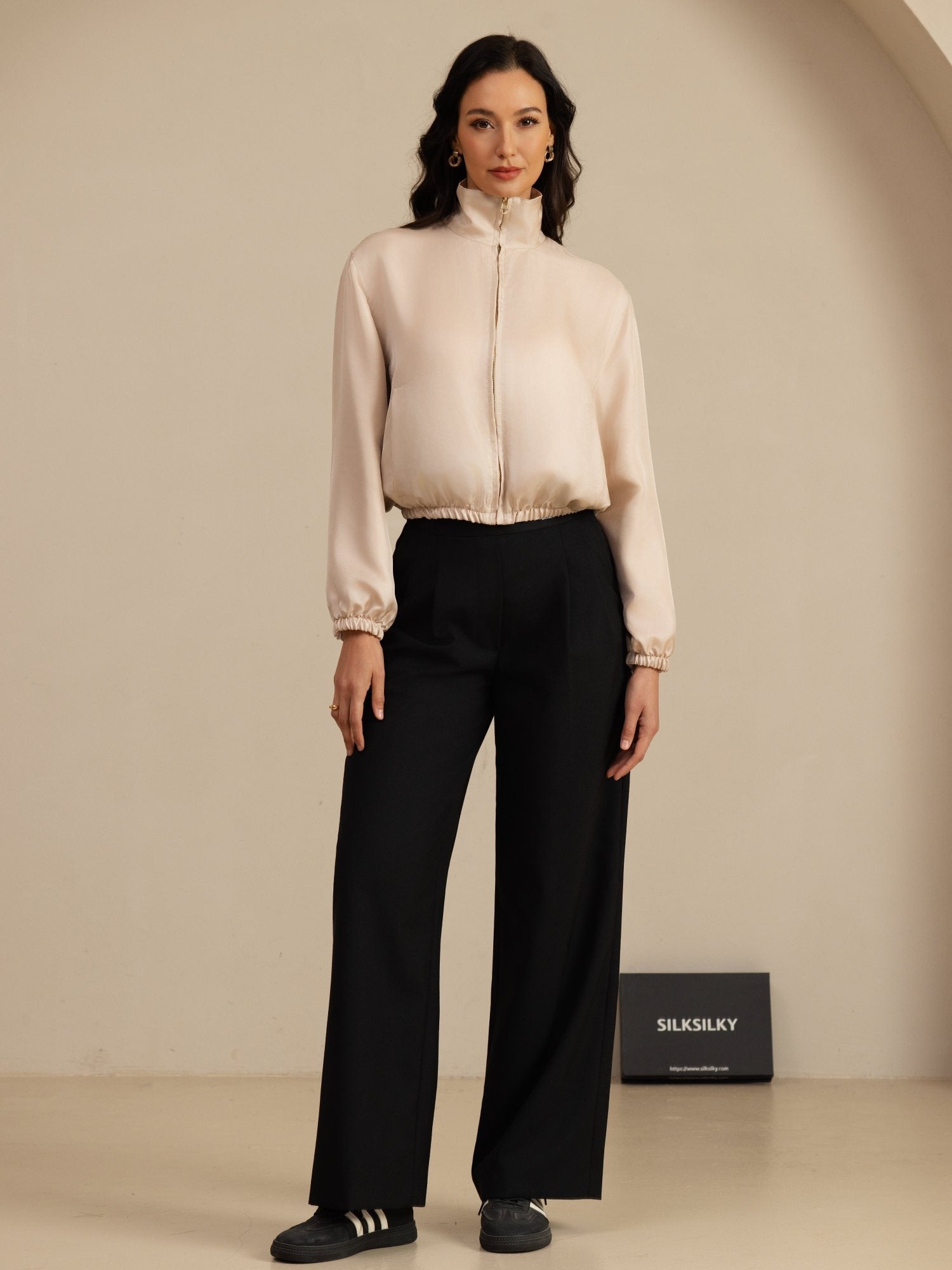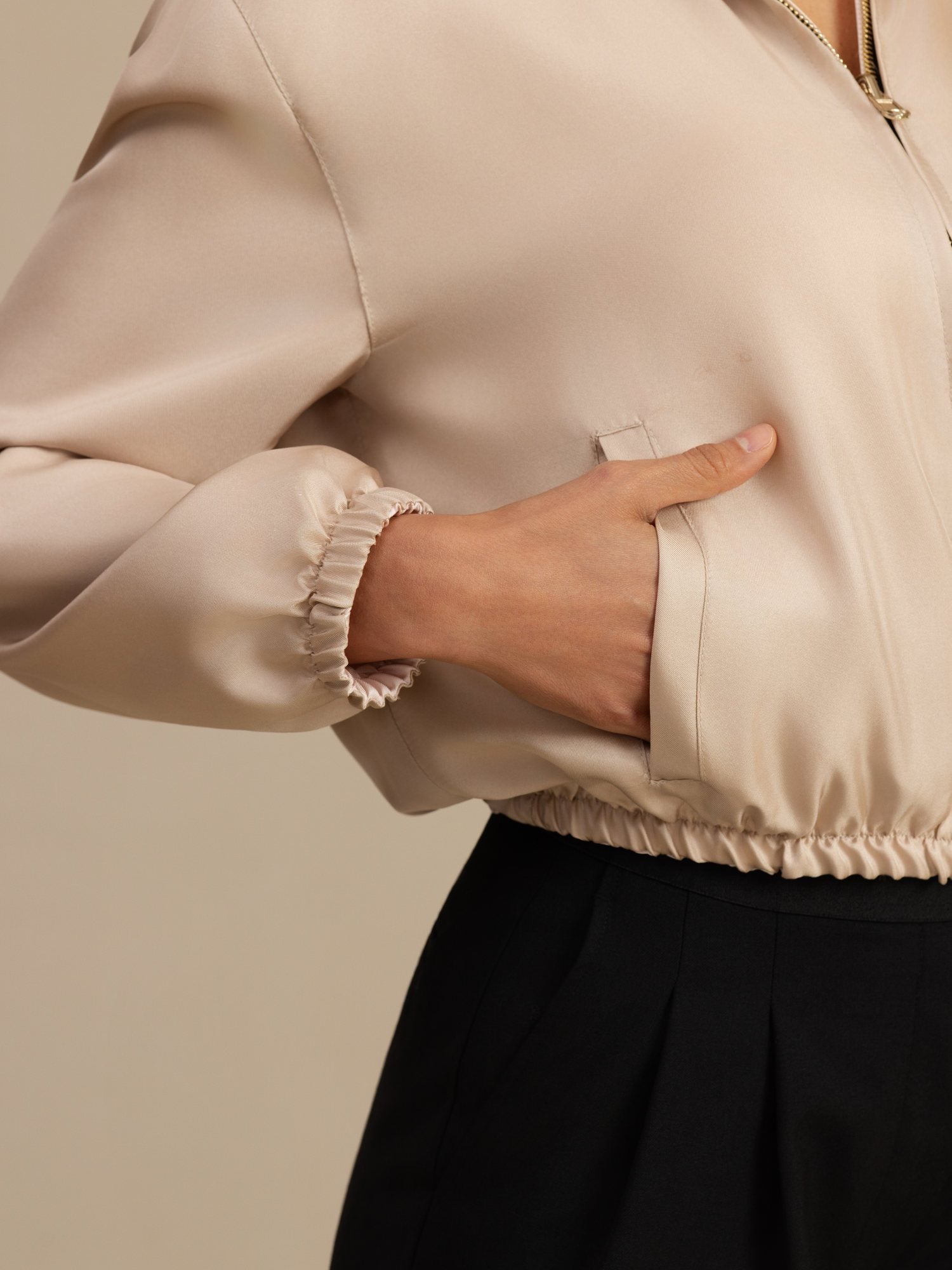 Made from 18Momme silk satin surah, this jacket features a smooth, lustrous finish with a lightweight feel. The structured stand collar and clean cropped silhouette create a modern, sporty edge, while the front zipper allows for easy styling. Designed with practical pockets and a flattering waist-length cut, it enhances proportions while ensuring comfort. Ideal for both casual wear and light activity, this silk jacket blends everyday ease with refined elegance.