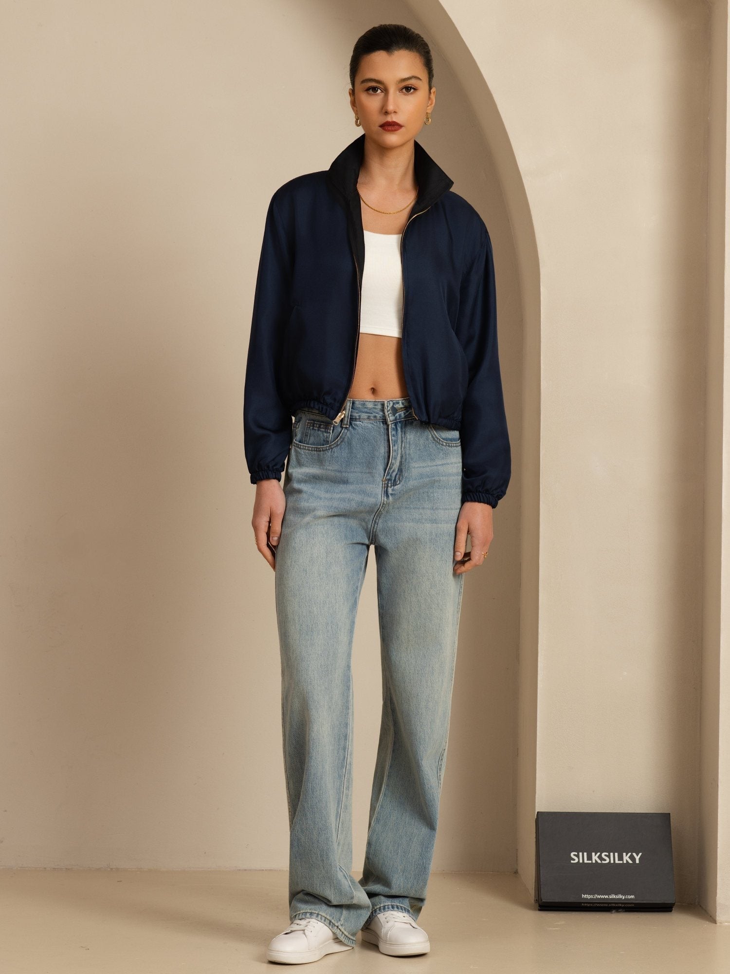 Pure Silk Women's Short Stand Collar Reversible Jacket With Pockets