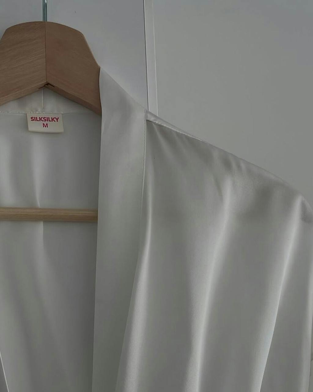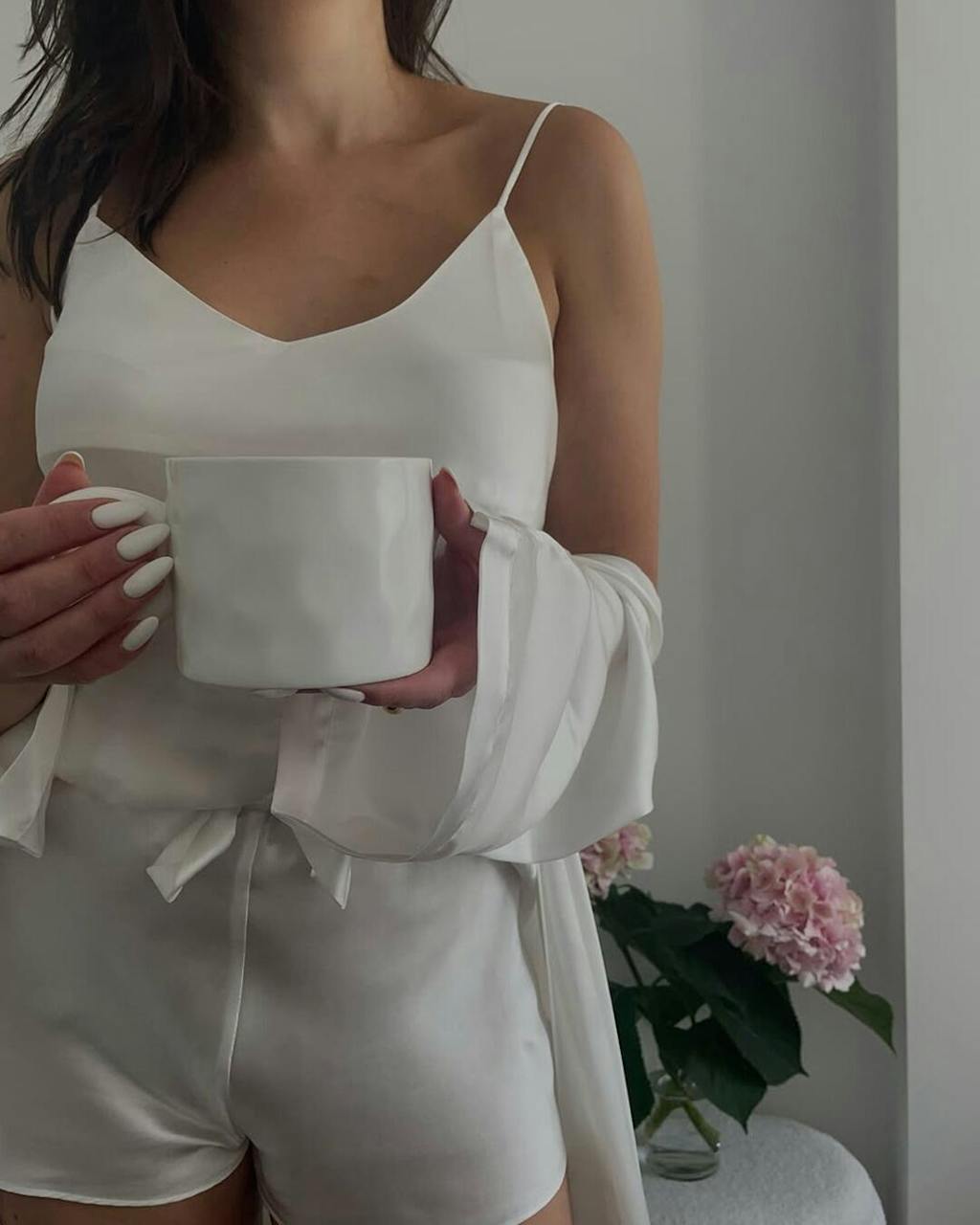Proprio il tipo di pigiama che volevo: comodo ma comunque elegante. La seta bianca ha un bagliore delicato e si sente molto morbida sulla pelle.